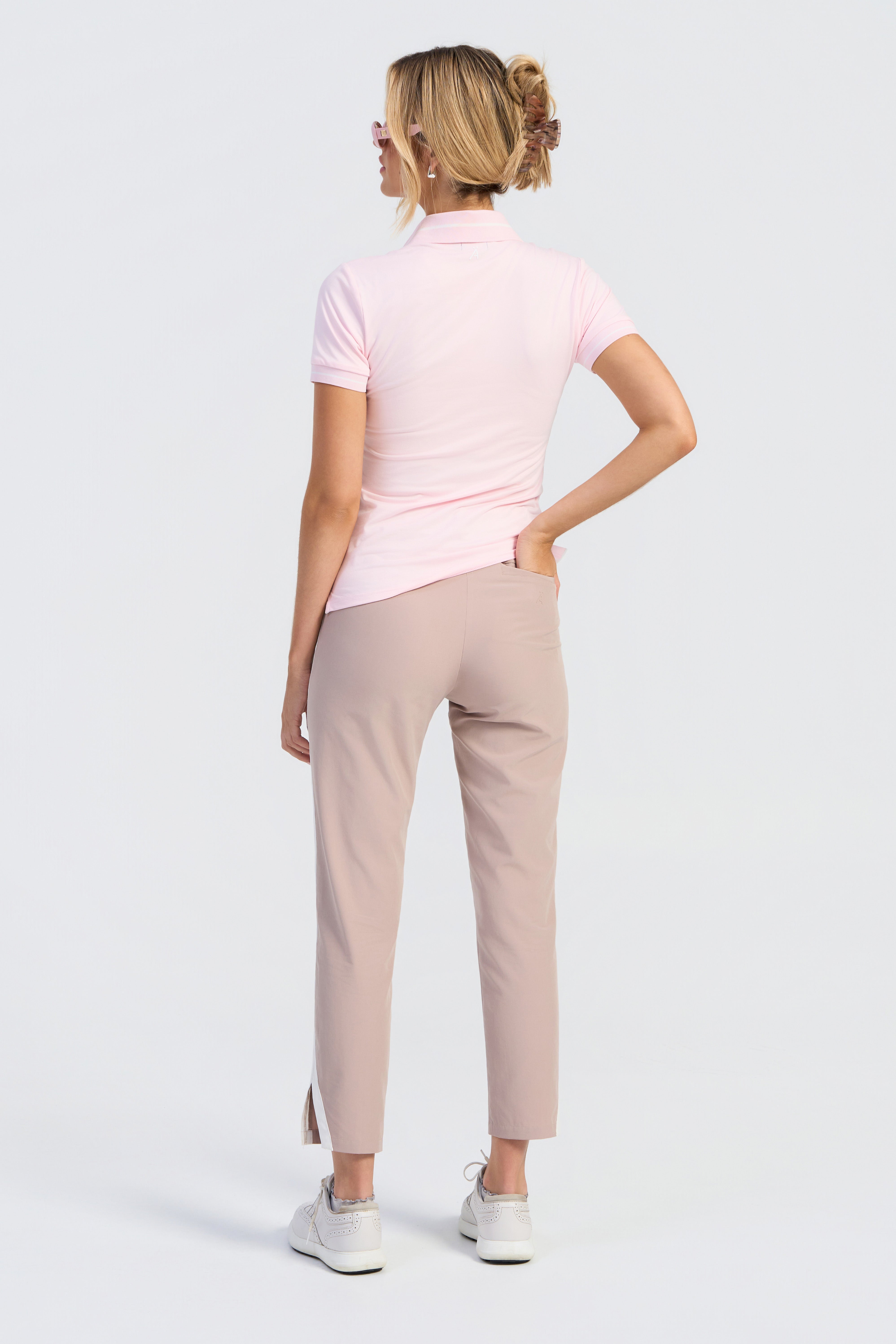 With a streamlined fit and soft colour the Michelle Polo will surely add an elegant touch to any outfit. Made with a moisture-wicking 4-way stretch brushed polyester this silky soft fabric will keep you dry and comfortable on the course. Pair this top with the Cindy Trousers for a fully elevated look.